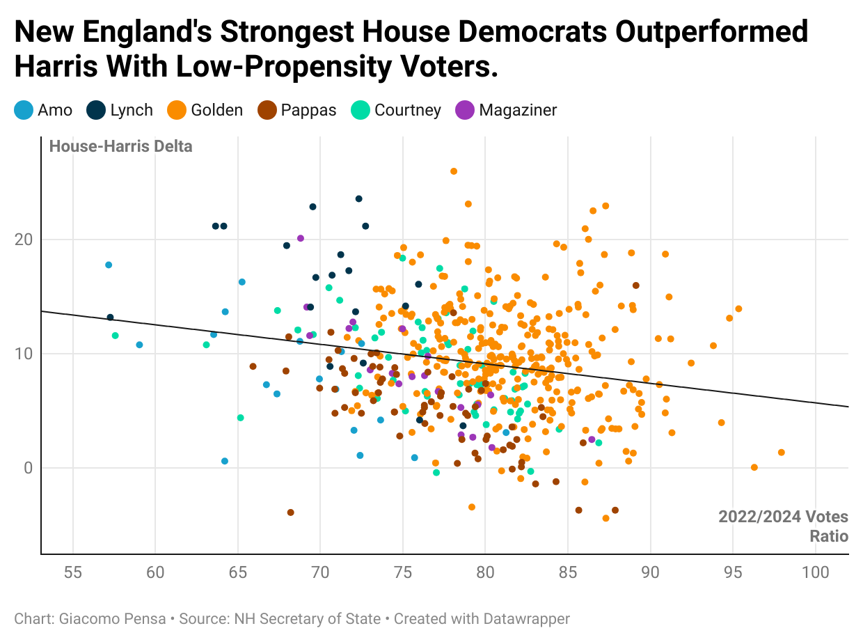This stands in contrast to New England’s weakest congressional Democrats, who did only 1.3% better than Harris. Massachusetts Senator Elizabeth Warren, for instance, ran six points behind the top of the ticket. These candidates, closer to the progressive wing of the party, did best relative to Harris in low-propensity areas, while suffering with high-propensity voters.
