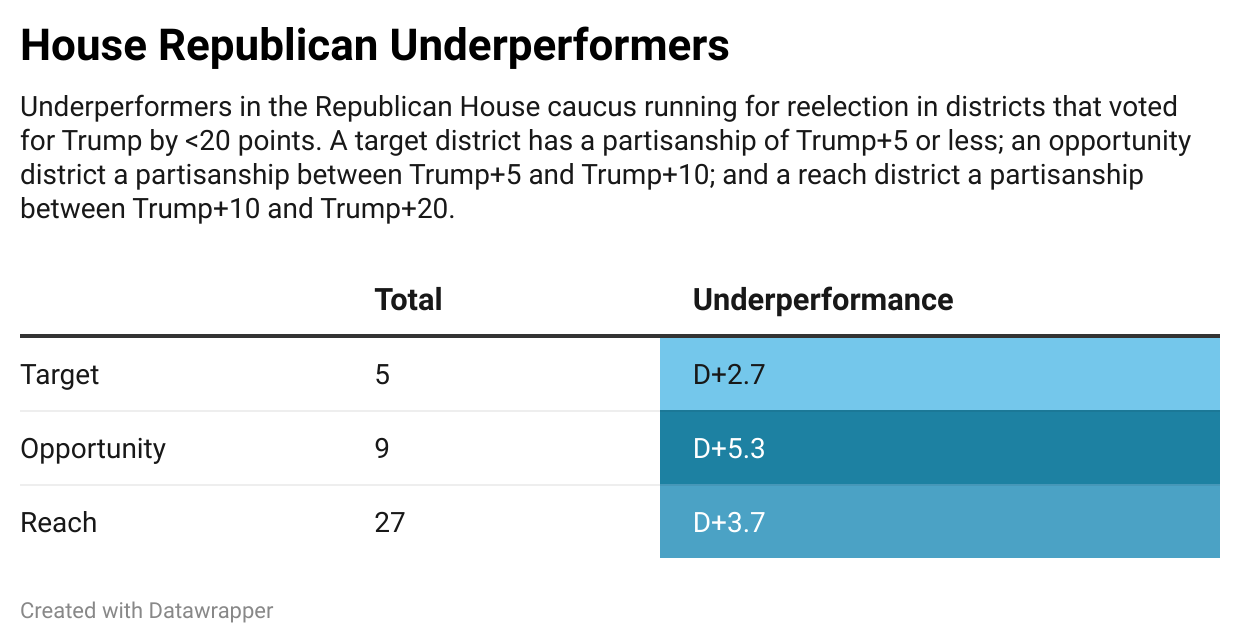 Of the current Republican incumbents who underperformed last November, a total of 41 are running for reelection in districts that voted for Trump by 20 points or less: 5 in target seats (average underperformance of D+2.7); 9 in opportunity seats (average underperformance D+5.3); and 27 in reach seats (average underperformance D+3.7).